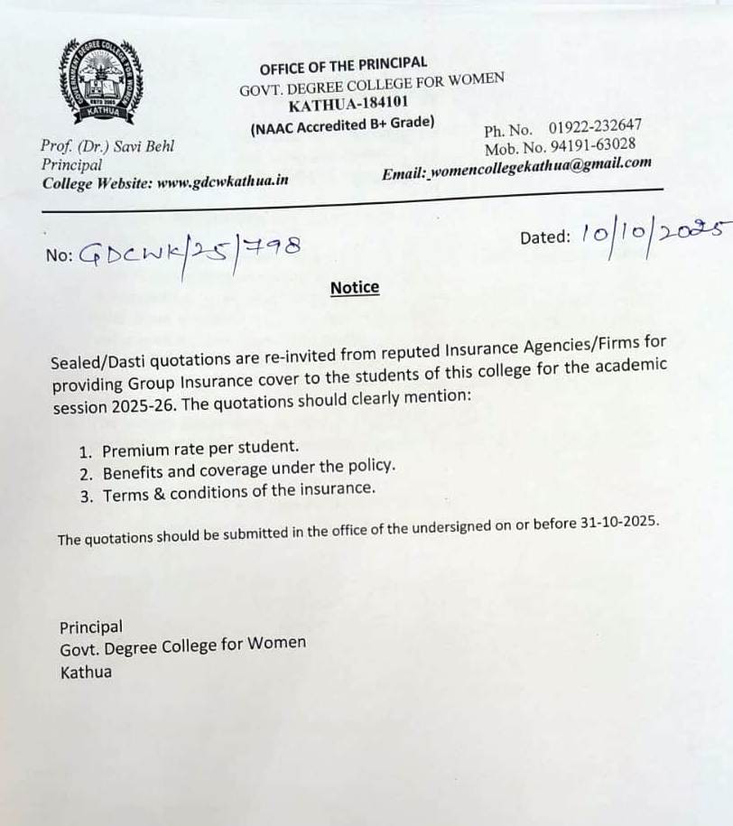 Sealed/Dasti quotations are invited from reputed Insurance Agencies/Firms for providing Group Insurance cover to the students of this college for the academic session 2025–26.